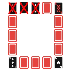 Bij een foute gok worden alle kaarten die verbonden zijn met de foute kaart verwijderd. Voor de open beginkaarten in de hoeken plaats je een nieuwe open kaart terug.